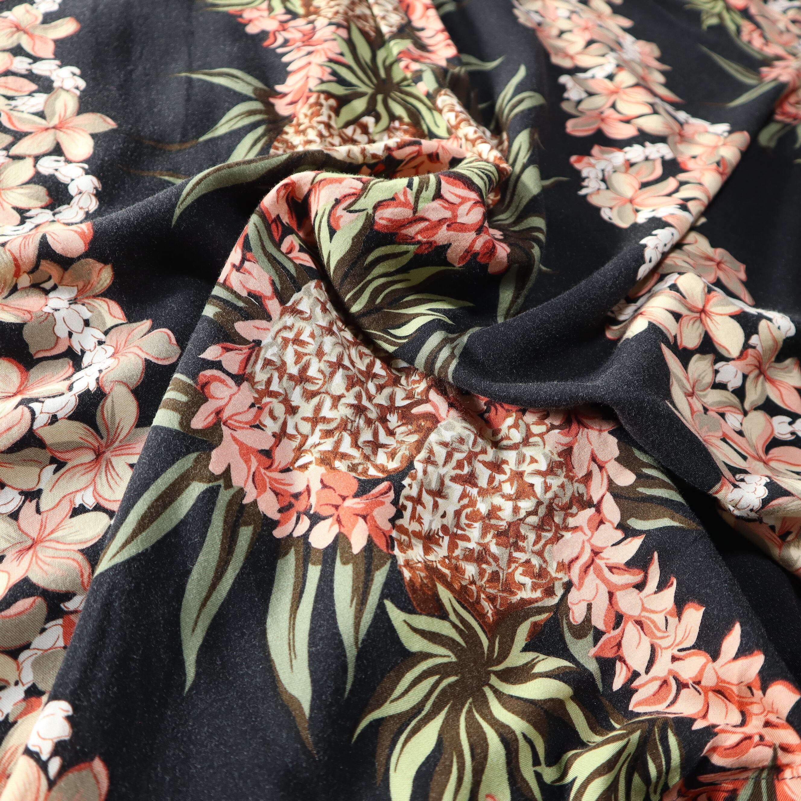 黒いベースにピンクのボタニカル柄がかわいい1枚。パイナップルの存在感も良い。